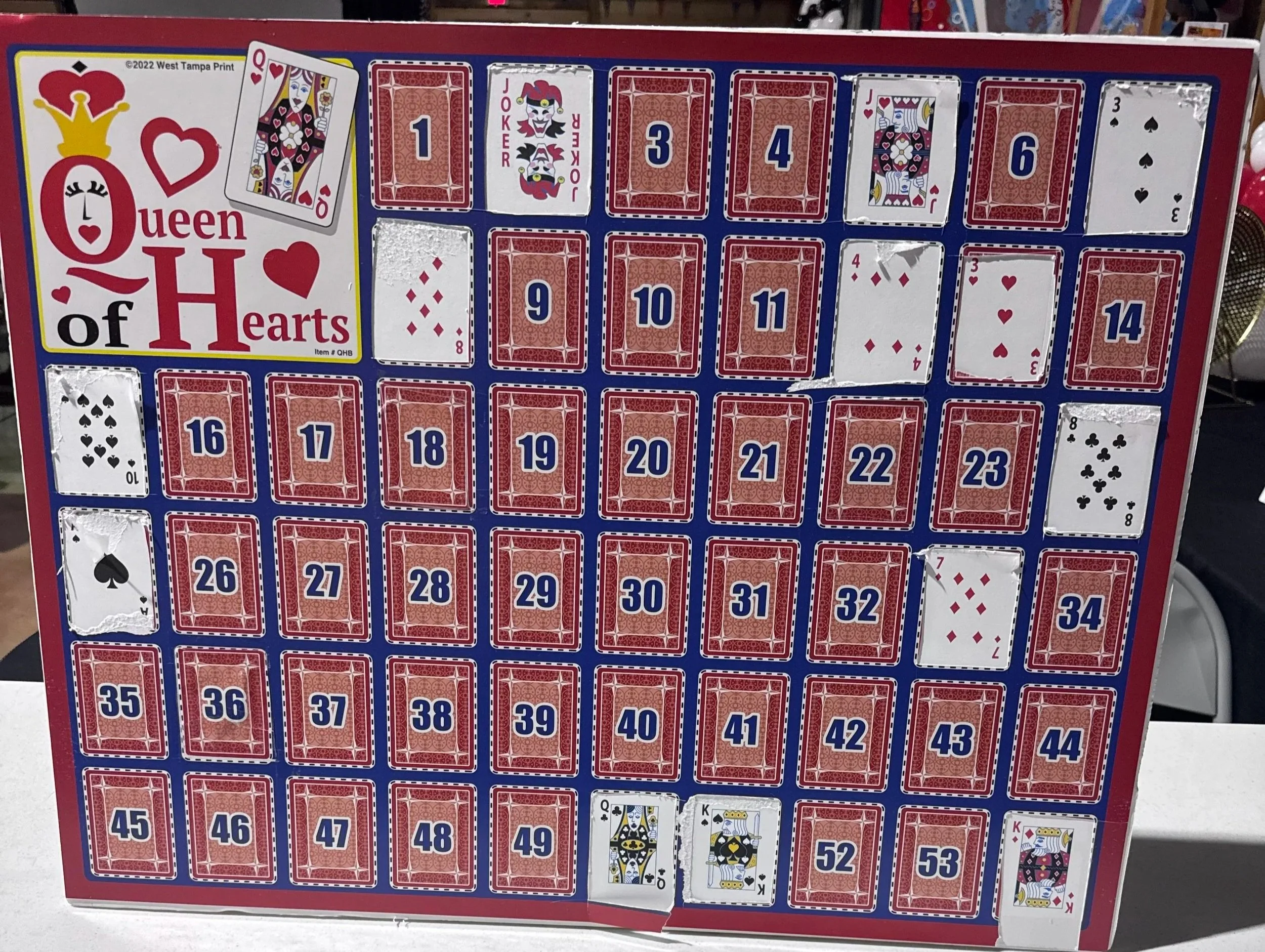 1. A manufactured game board of 54 playing cards will be displayed with the card faces hidden. The Queen of Hearts is the Progressive Jackpot winning card.