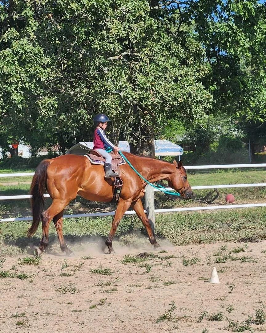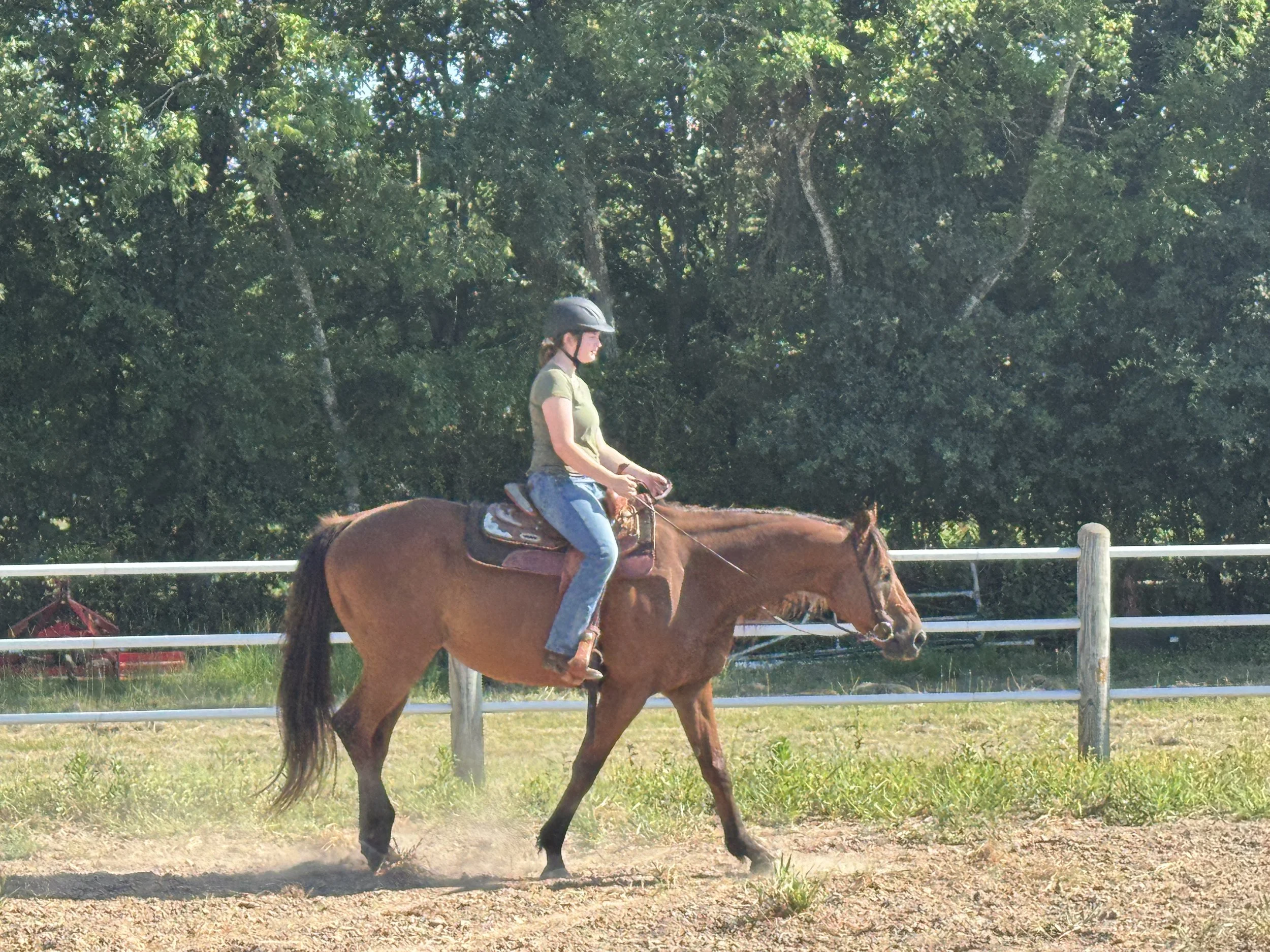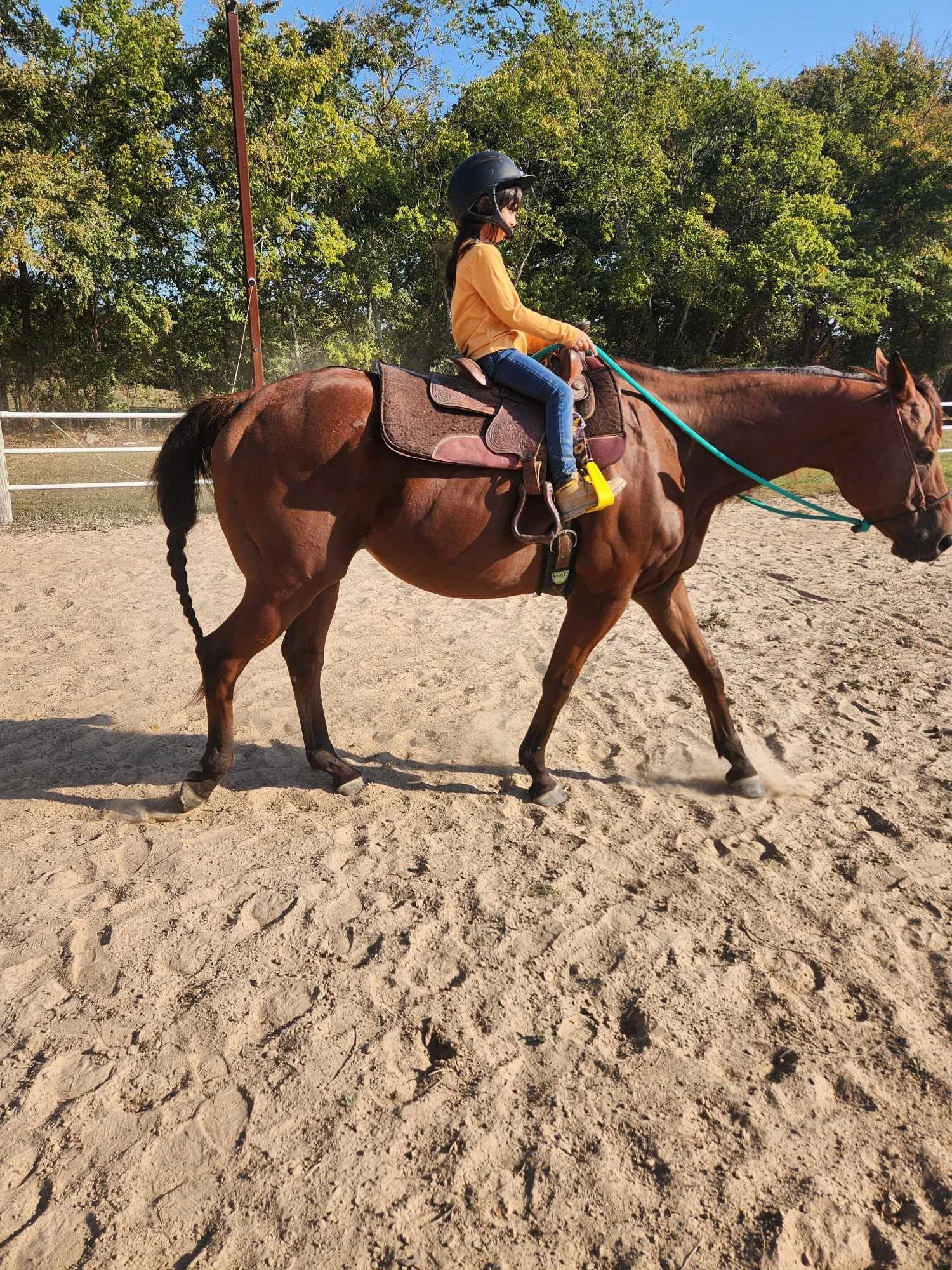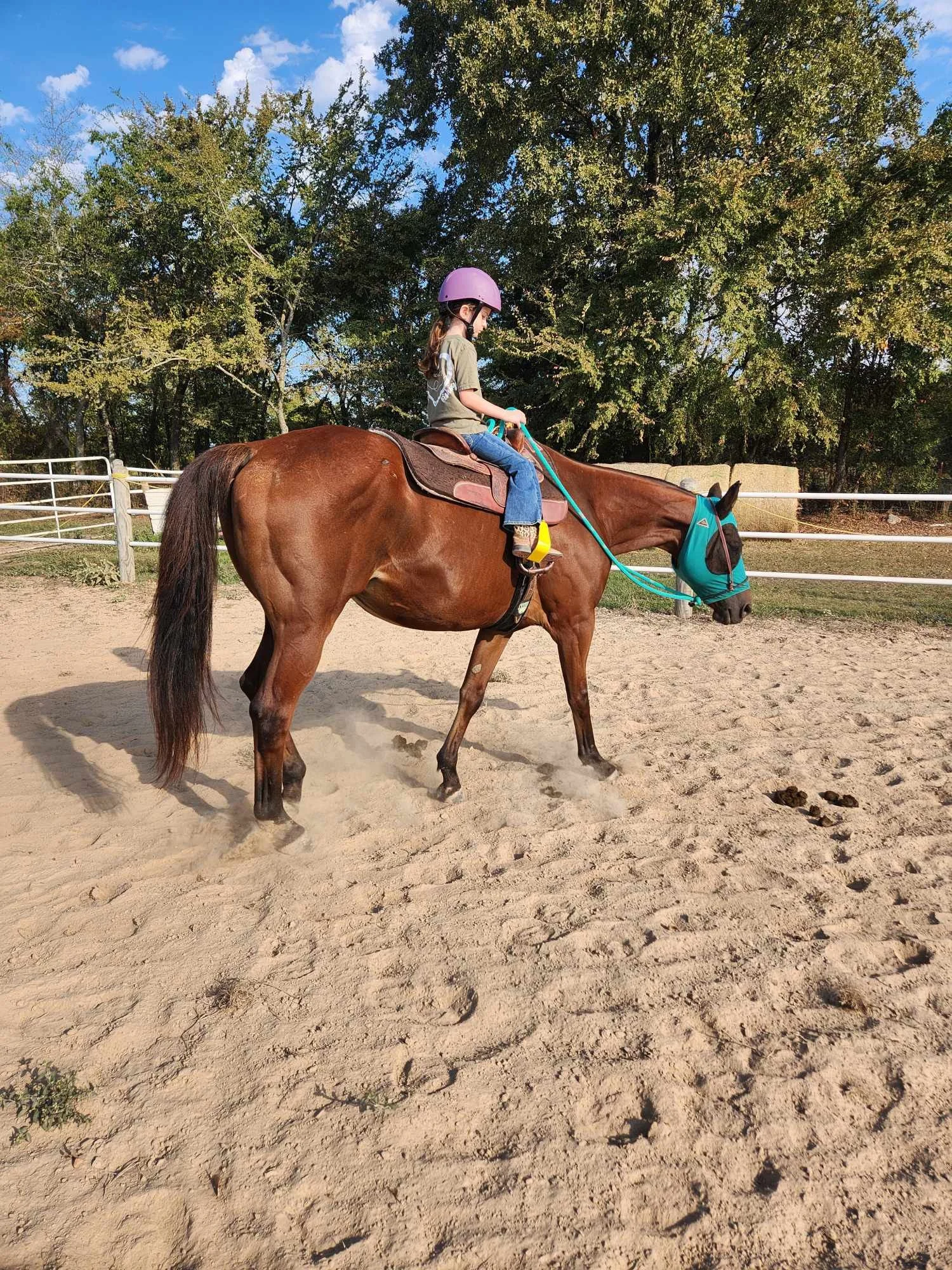 Moose has become an important part of our lesson program, as he is always very calm, easy-going, and trustworthy. Because he’s not the lean, English-style of Thoroughbred, he primarily rides western, and Western Dressage seems to be more his style, for which he has already won blue ribbons as well as a Reserve Champion in In-Hand Dressage.